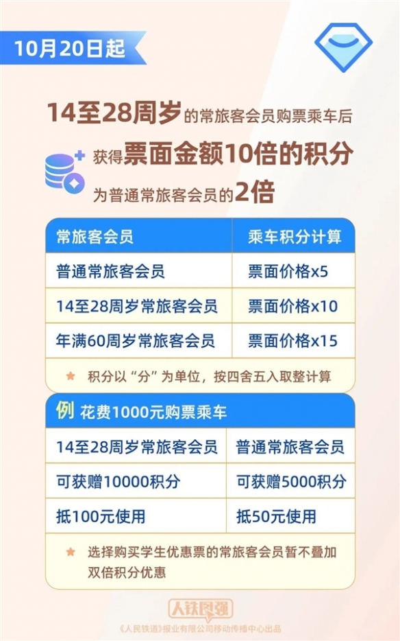 自10月20日起,14至28周岁的常旅客会员在购票乘车后,将获得票面金额10倍的积分,为普通会员积分累积速度的两倍。举例而言,若普通会员花费1000元购票,可获5000积分(相当于50元);而同一年龄段的青年会员在同等消费下可获得10000积分(相当于100元)。