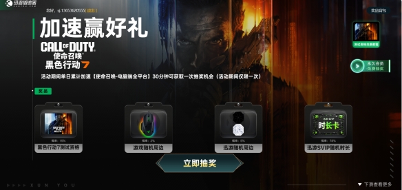 接着下滑找到【加速赢好礼】活动,只需玩家使用迅游加速器对【使命召唤系列任意游戏】加速30分钟即可获取本次机会