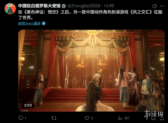 网易旗下备受瞩目的开放世界武侠大作《 燕云十六声 》自 11 月 15 日正式登陆海外市场以来,迅速在全球范围内掀起新一轮“武侠热潮”。今日,中国驻白俄罗斯大使馆官方账号在社交媒体上发布动态,高度评价该作是“继《黑神话:悟空》之后,又一款征服世界的中国 ARPG 力作”。