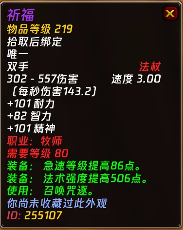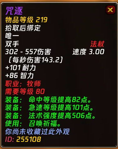 牧师的史诗杖可以在【祈福】和【咒逐】之间切换。因为P1没有什么像样的法系单手武器,所以这两把武器还是挺强力的。而且装等高达219,比其他主副手搭配还要强一些。