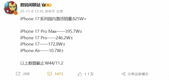iPhone 17曾于9月19日正式发售,在不到两个月的时间里,中国市场月均激活量超过500万部。该博主此前透露,截至11月2日,iPhone 17系列在国内的激活销量已超过825万部,其中iPhone 17 Pro Max表现最佳,占据了近一半的销量。