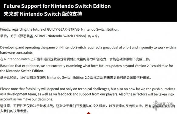 “针对《罪恶装备:斗争》Nintendo Switch版的未来,我们正在研究2.0版本之后可能采取的更新形式。在Switch平台上开发和运营游戏,需要我们在硬件限制下付出大量努力并发挥创意。基于此经验,我们正在谨慎评估后续更新的可行性。”