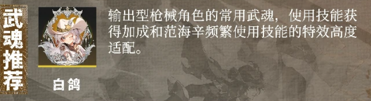 目前如果给范海辛搭配武魂的话,建议大家搭配的就是白鸽,这个武魂是目前给输出型的家具角色最好搭配的一个武魂,所以跟范海辛搭配的话,也是可以带来他专属的加成能力,这里体现在范海辛可以使用技能的频次上面会有更多的效果,而且在后期的特效高度上面也比较适配于范海辛,所以在配置当中大家如果有白鸽这个武魂的话,最好是跟范海辛搭配上。