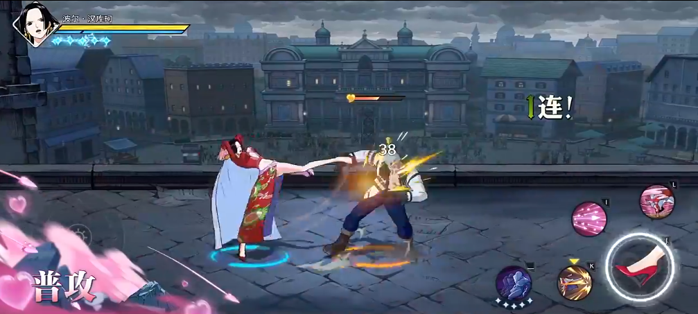 普通攻击共五段:前两段为高速连环踢击;第三段释放标志性技能“吻枪”,造成中距离突进伤害;随后接续三段强化踢技,将目标击飞并重踏压制;若在最后一段后再次点击普攻键,可连续发动多段“吻枪”,形成高频压制节奏。