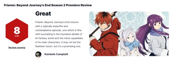 IGN简评:《葬送的芙莉莲》第二季首播回归,以一贯精美的画面与沉思性的叙事,从容铺展奇幻世界的细腻日常与角色间的微妙互动。它或许不是最华丽的回归,却展露扎实的叙事潜力。