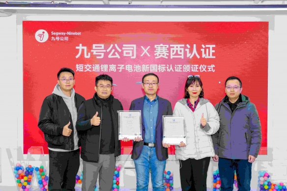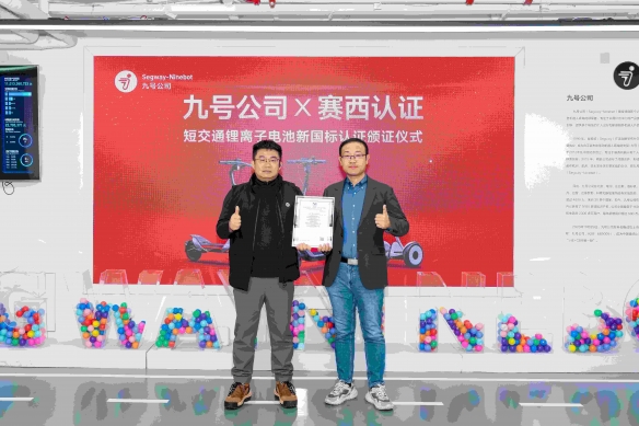 北京赛西认证有限责任公司认证中心副主任杨檬携认证中心及安全中心代表到访九号北京总部,并与九号公司共同举行了短交通产品新国标电池认证颁证仪式。此次颁证志着九号在滑板车、平衡车电池安全领域率先完成了强制性国家标准的体系化验证,也意味着九号成为行业首家并且唯一完成新国标产品切换、并具备全流程符合性能力的企业。