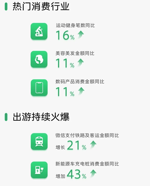 从消费场景来看,出行与服务类消费增长显著。微信支付在铁路及客运方面的金额同比增长21%,新能源车充电桩消费金额同比大幅增长43%,反映出假日期间自驾出行的持续升温。与此同时,运动健身类消费笔数同比增长16%,美容美发与数码产品消费金额均实现11%的同比增长。