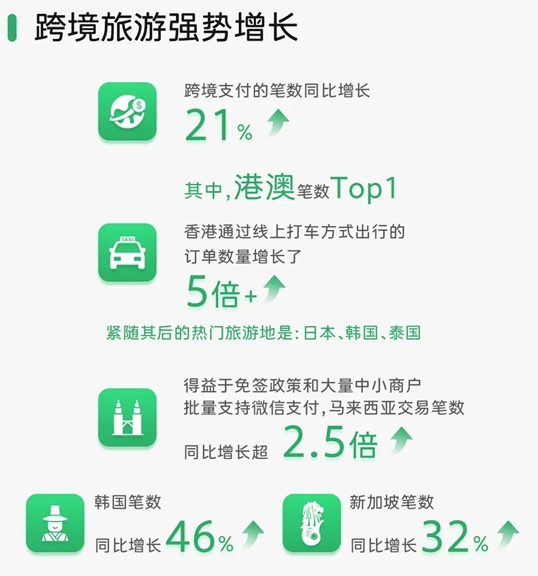 跨境消费同样呈现火热态势。微信跨境支付笔数同比增长21%,港澳地区仍是内地游客出境首选目的地,香港线上打车订单量增长达5倍。港人北上消费同样活跃,交易笔数同比增长超过120%,其中电商、宠物及快递服务成为消费增速前三的品类。