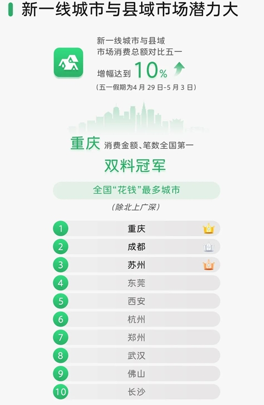 重庆在此次假期中表现尤为突出,微信支付消费金额与笔数双双位居全国第一,成为除北上广深外消费力最强的城市。消费力城市前十名还包括成都、苏州、东莞、西安、杭州、郑州、武汉、佛山和长沙。