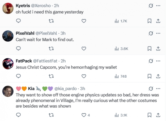 另一位玩家则幽默道,“卡普空,请掏空我的钱包。”也有玩家表示,“这下真的是不得不买了。”