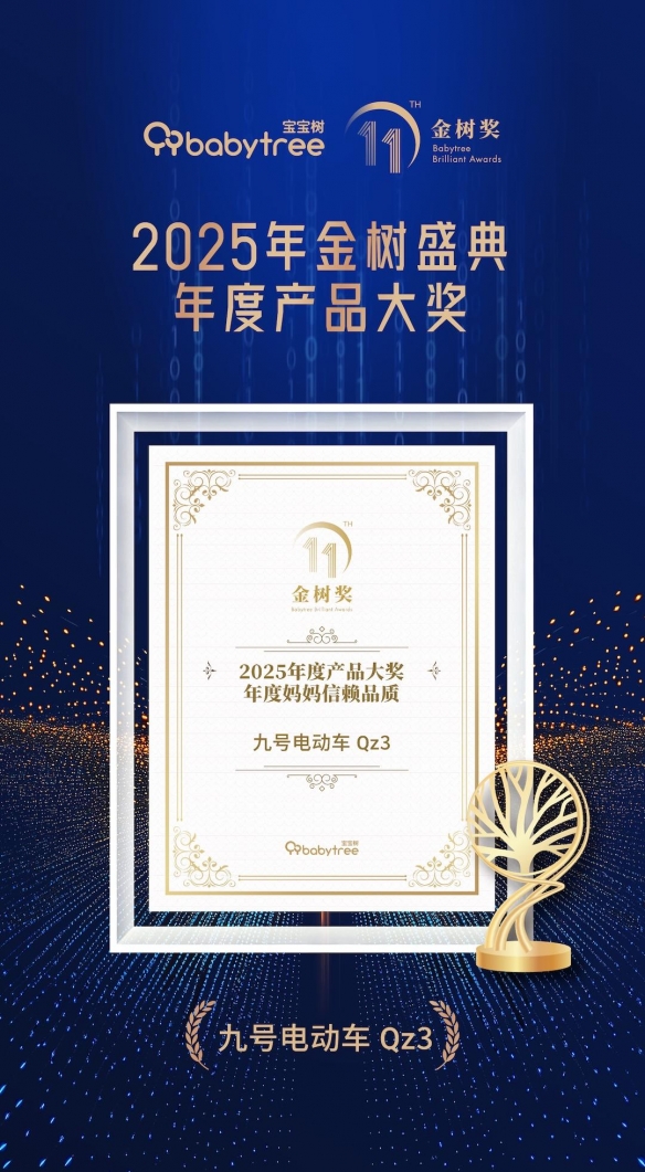 近日,在备受行业关注的 2025年金树盛典 上,九号电动 Q3 系列凭借其出色的产品实力和深刻洞察用户需求,从众多优秀作品中脱颖而出,斩获 “年度妈妈信赖品质” 大奖。