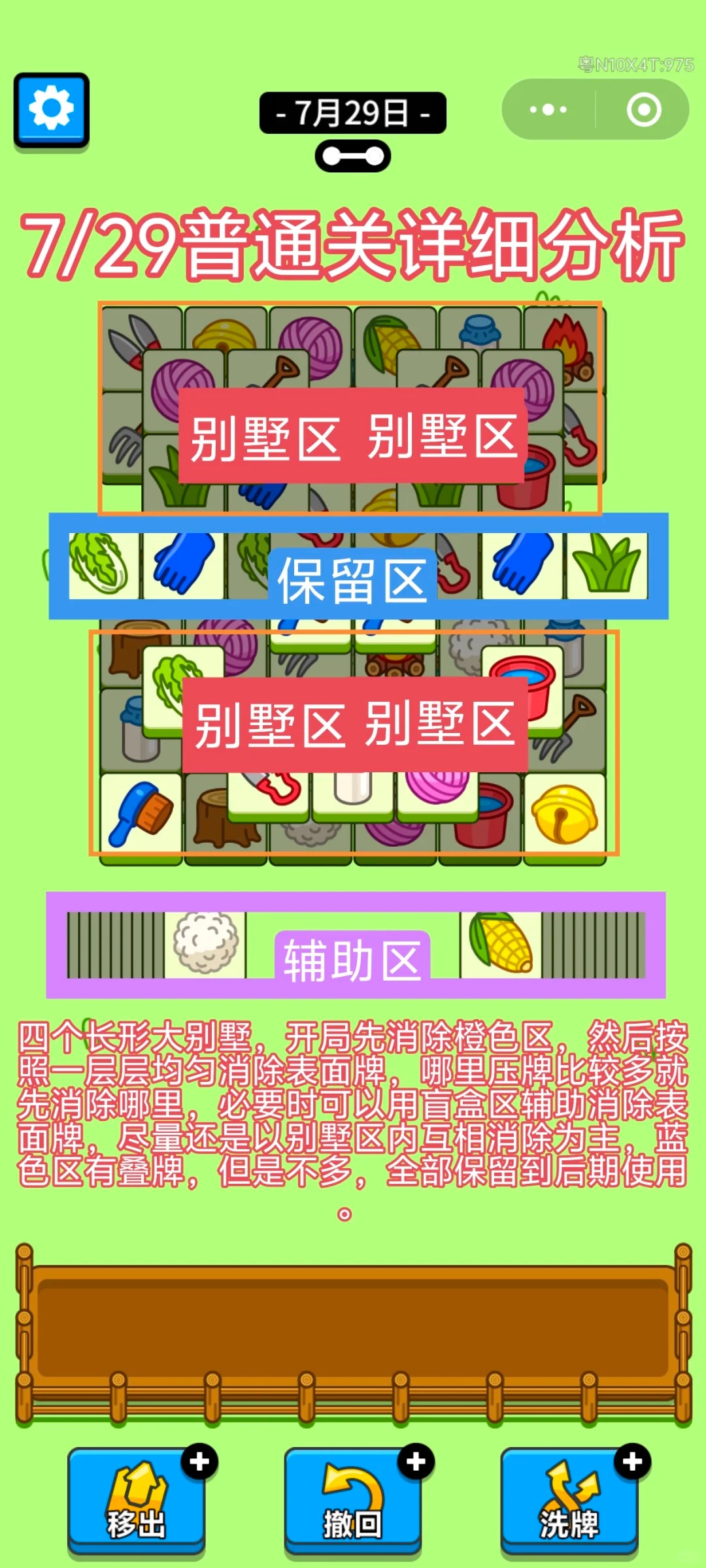 2⃣开局先消除橙色区的牌,这里压牌。尽量要让牌面保持在同一水平面,然后一层一层消除表面牌,不要跨层太多拿牌,等表面牌消除完后,以大别墅内互相消除为主。
