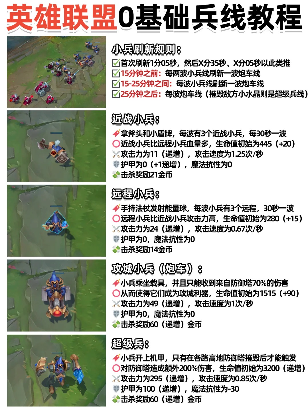 线上英雄可以靠兵线获取经验,一波兵线中包含三个近战小兵,三个远程小兵,近战兵金币多,优先补、远程兵血量低,但容易被抢,炮车兵钱超多!必抢!小兵是主要经济来源,最后一击补刀才有钱!(具体参考图2)