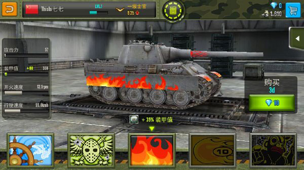 除了对坦克内部系统的改造升级,玩家还可以对坦克外观的纹理花纹进行修改喷涂。虽然挽歌不知道为什么,但是对外表的改装同时也有效果附加!涂装主要附加的是攻击力和攻击速度,玩家可以自由选择所需要的类型进行涂装,纹理图案多样,看得挽歌目不暇接。玩家可以以此打造出属于自己外观的不同战车。