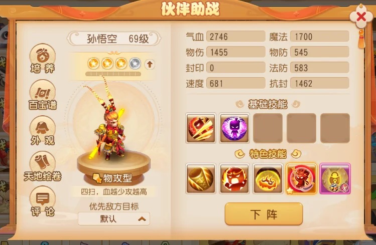 培养建议:前期升到2星解锁召唤小猴即可,避免过度投入资源(易倒地需惠岸频繁复活)。
