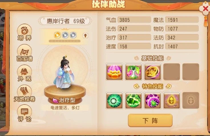 培养建议:升2星激活技能“一元复始”,与惠岸形成双保险。