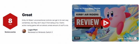 IGN简评:《卡比的驭天飞行者》的非传统操控方式有时会成为自身的阻碍,但这并不妨碍它成为一款充满乐趣、节奏紧张的竞速游戏,而且可玩内容多得让人不可思议。