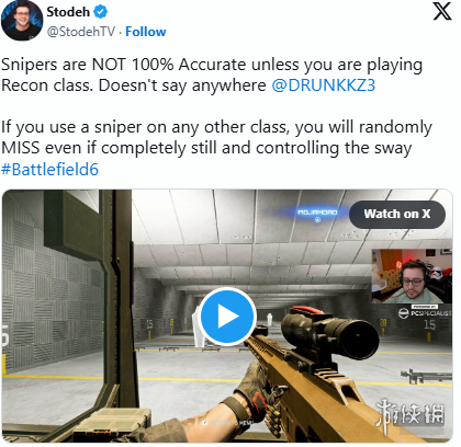 近日,主播StodehTV在推特发布了关于训练场测试狙击枪的片段。视频中他两次完美瞄准目标却未命中,直至第三次以相同瞄准方式才成功击中。据其分析,若玩家未选用侦察兵职业,狙击子弹将随机偏离目标,且系统未对此机制作出说明。