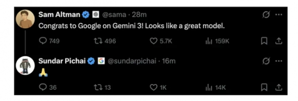 谷歌发布新一代推理模型Gemini 3.0 Pro,同步上线Google AI Studio预览版并开放API,即将接入旗下产品。OpenAI CEO阿尔特曼与马斯克先后致贺,皮查伊以表情包回应。