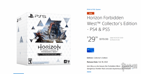 PlayStation将《地平线:西之绝境》典藏版的价格直降150美元(约合1066元)。该典藏版原价为180美元,内含《西之绝境》数字版、铁盒及两件模型,促销后仅售30美元(约合213元)。