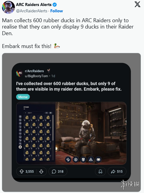 一位Reddit用户"BigBootyTom"在游戏官方版块展示了成果:“我收集了600多只橡皮鸭,但基地里只能看到9只。”配图中他的角色身旁仅陈列着寥寥九只橡皮鸭,“Embark,请修复这个显示问题。”