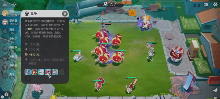 另外在输出的时候因为有这样的竞争原理,在奖励效果上面也会有更多的提升,一般在达到100分的时候就可以提升所有竞争类型的精灵,它本身的攻击数值以及魔法上面的强度,这里的增幅达到了35%的数值,如果是在200积分的时候可以提供他的输出能力,额外带出6个迅捷刺拳的攻击方式,那么这里的这个刺拳会随机带来攻击目标,对敌人造成了输出之后,这个魔法伤害还可以克制到敌方的一些敌人,那么在达到400积分的时候,他会发射的技能是左勾拳以及右勾拳,当然这里进行输出的同时,也是随机选择一个伤害目标的,所以在搭配阵容方面,大家如果想要把这个桂冠鼠玩儿好的话,这里就可以要选择更多竞争原理的精灵,这样也可以达到整体阵容里面积分快速累积的效果。