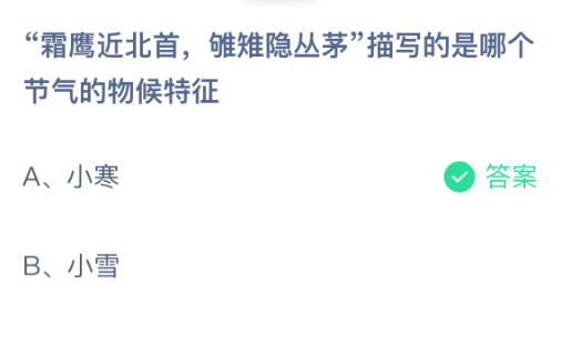 霜鹰近北首,雊雉隐丛茅描写的是哪个节气的物候特征?支付宝小鸡课堂开课啦!每天花一分钟答题赚饲料,喂喂小鸡就能贡献爱心啦!轻松又意义十足!2026年1月5日蚂蚁庄园的小鸡课堂题目正确答案是【小寒】,霜鹰近北首,雊雉隐丛茅描写的是【小寒】节气的物候特征。