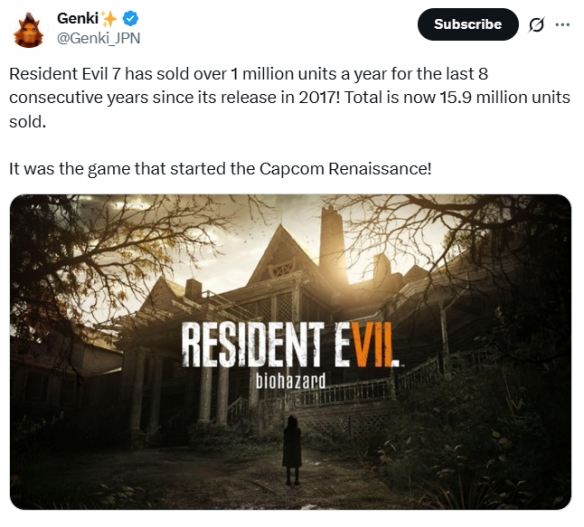 近日,卡普空在最新的财报中更新了旗下主要作品的销量成绩。据国外推主@Genki_JPN消息,自2017年发布以来,《 生化危机7 》已连续8年年销量超过100万份,目前总销量已达到1590万份。