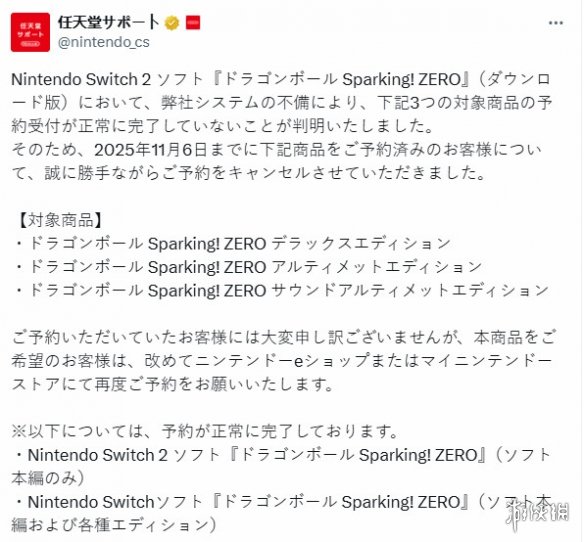 任天堂今日发布官方公告,就其系统问题导致Switch 2平台《 七龙珠:电光炸裂!ZERO (DRAGON BALL: Sparking! ZERO)》部分数字版商品预购失败一事向玩家致歉。由于系统记录异常,部分特殊版本的预购未能成功处理。
