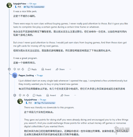 用户“SaiyajinPrime”称,这个计划堪称“不错的小福利”:“即便不买游戏也能赚取代币,像在特定时间段玩指定游戏这类任务就能实现。不过我平时没太留意这些,我主要是通过购买游戏来赚取代币,然后用这些代币兑换礼品卡,用来抵扣下一款游戏的费用,这个计划真的很不错。”