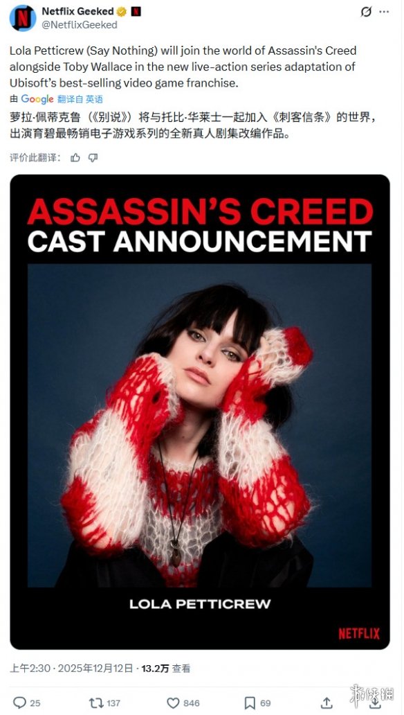 据国外媒体消息称,爱尔兰演员洛拉·佩蒂克鲁(Lola Petticrew)近日确认加入网飞真人剧集《刺客信条》的演出阵容,她将与此前已公布的演员托比·华莱士(Toby Wallace)搭档,担任本剧女主角。佩蒂克鲁在剧中具体饰演的角色信息目前尚未对外公开。该剧计划于2026年在意大利启动拍摄。