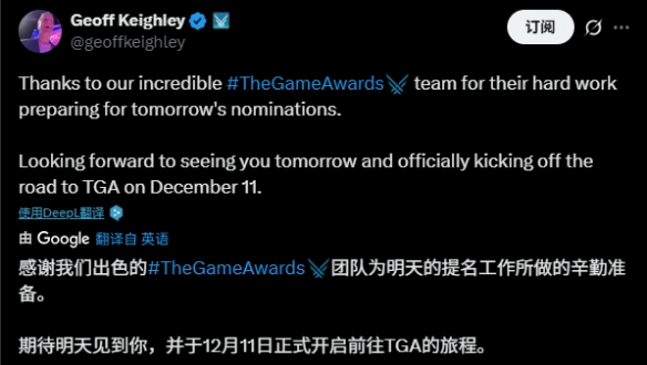 今日,TGA主持人Geoff Keighley在社交媒体上发文预热,宣布提名名单将于明日公布,并对团队为提名工作所付出的辛勤努力表示感谢。