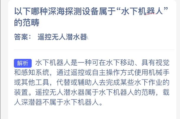 以下哪种深海探测设备属于“水下机器人”的范畴?【神奇海洋】12月12日新题目已开答!正确答案现已公布,点击领取拼图,一起为修复海洋生态贡献力量!今日正确答案是:【遥控无人潜水器】。水下机器人可通过遥控或自主操作方式使用机械手或其他工具,代替或辅助人去完成某些水下作业的装置。