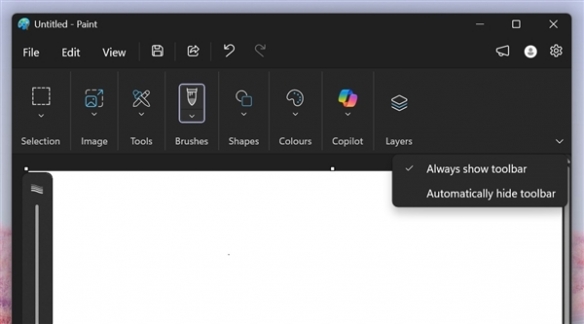 随着画图应用逐渐采用“现代化”界面设计,其顶部工具栏所占用的屏幕空间也随之增大。为解决这一问题,新版加入了一键切换选项,用户可设定工具栏自动隐藏,仅在需要调整画笔大小、颜色或切换工具时呼出。这一改进不仅节省了屏幕空间,也让用户能更专注于画布内容,尤其在执行精细编辑、画面缩放或最终润色时更为便捷。