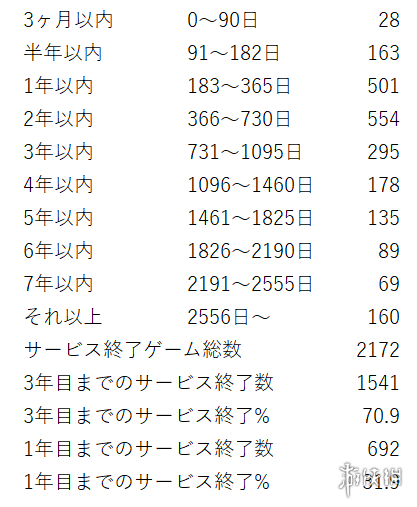 最新行业研究指出,日本抽卡制及在线服务型游戏正遭遇严峻生存考验。游戏研究者“怪しい隣人”对近2200款在线游戏进行统计后发现,70.9%的产品在运营不满三年时便停止服务,其中更有31.9%的游戏未能挺过第一年。