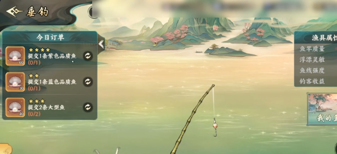 不同鱼饵对应的目标有所区别,不要乱买。蚯蚓饵专钓小型鱼,红虾饵针对大型鱼。浮游饵则主要是针对各种水中生物,精准的挑选,才能有效提升垂钓的成功几率。那重点要说的,那就是两条橙色鱼,只有来到商店去购买橙色鱼饵,才能够垂钓成功,光靠基础鱼饵就算垂钓时间很久也没有作用。当然橙色鱼饵也并非是万能的,只不过是可以提升成功的几率,而并没有办法增加触发橙色品质的几率。因此也建议大家不要盲目的去堆一大堆的橙色鱼饵,很有可能会浪费元宝,又很难见效。关键还是在于要懂得钓鱼的口诀。