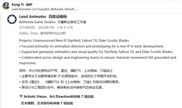 据网络消息,贝塞斯达达拉斯工作室可能已启动全新IP游戏开发。这一推测源于该工作室首席动画师Sung Yi在领英个人资料中披露的项目信息,其中提及一款未公开游戏,被列为工作室自2018年以来的开发项目之一。数据挖掘者bogorad222分析认为,该项目可能代号为"Spy Team"。