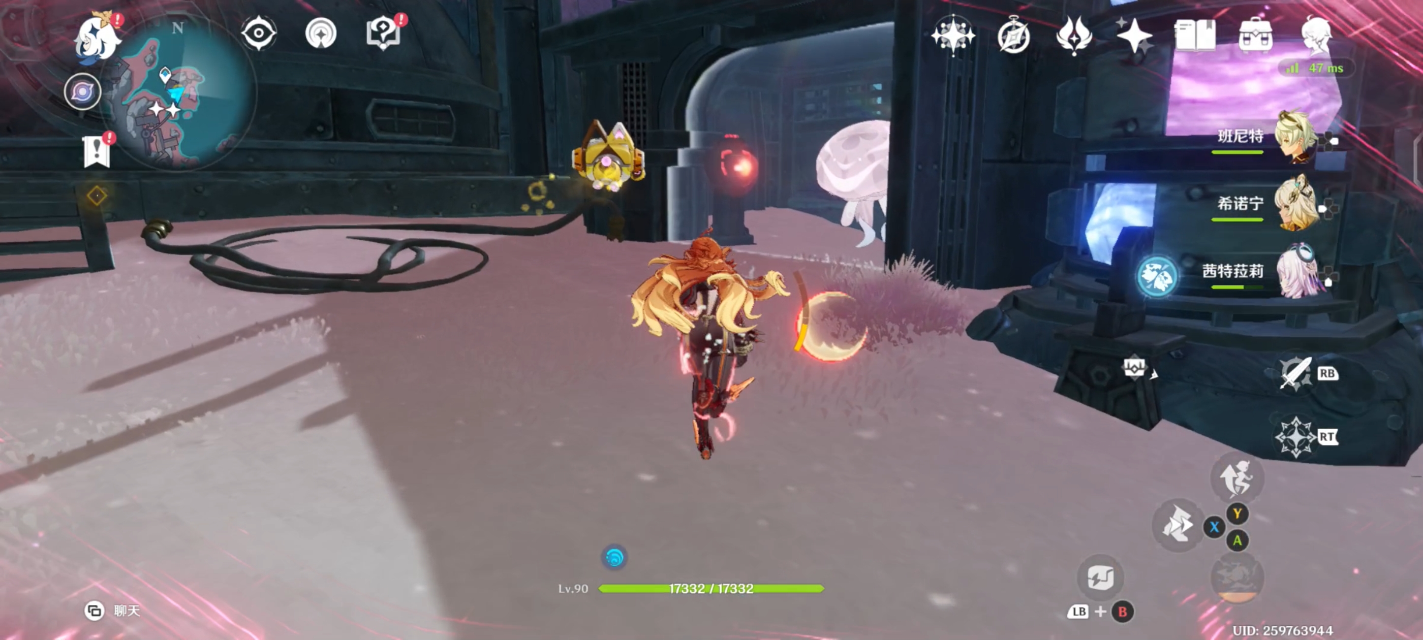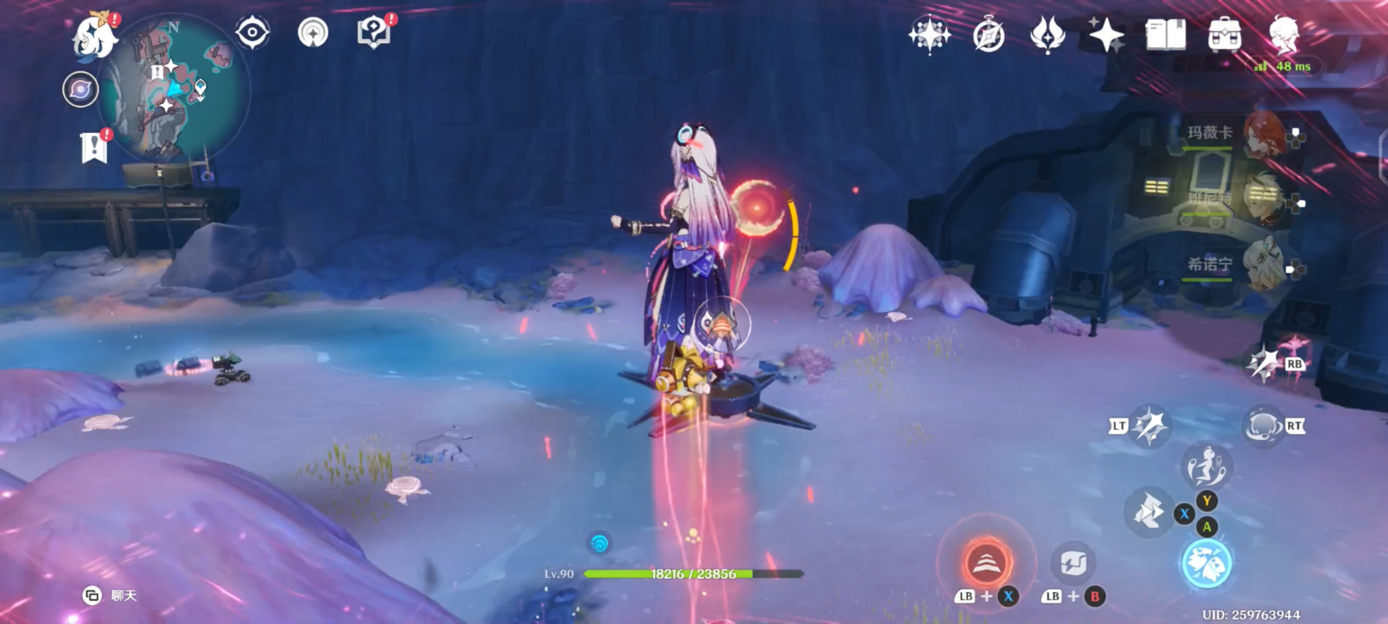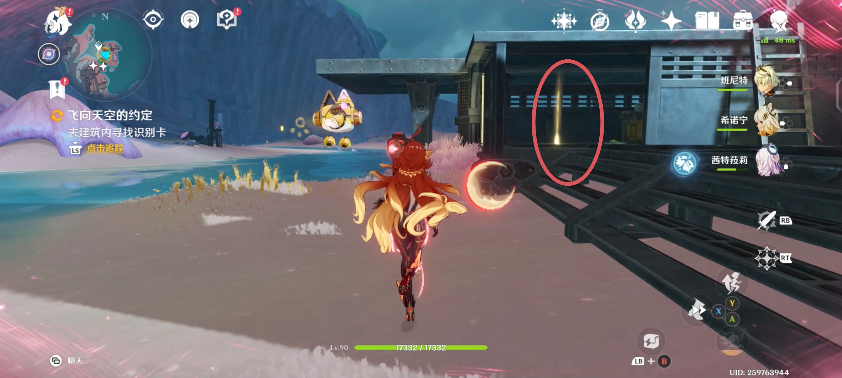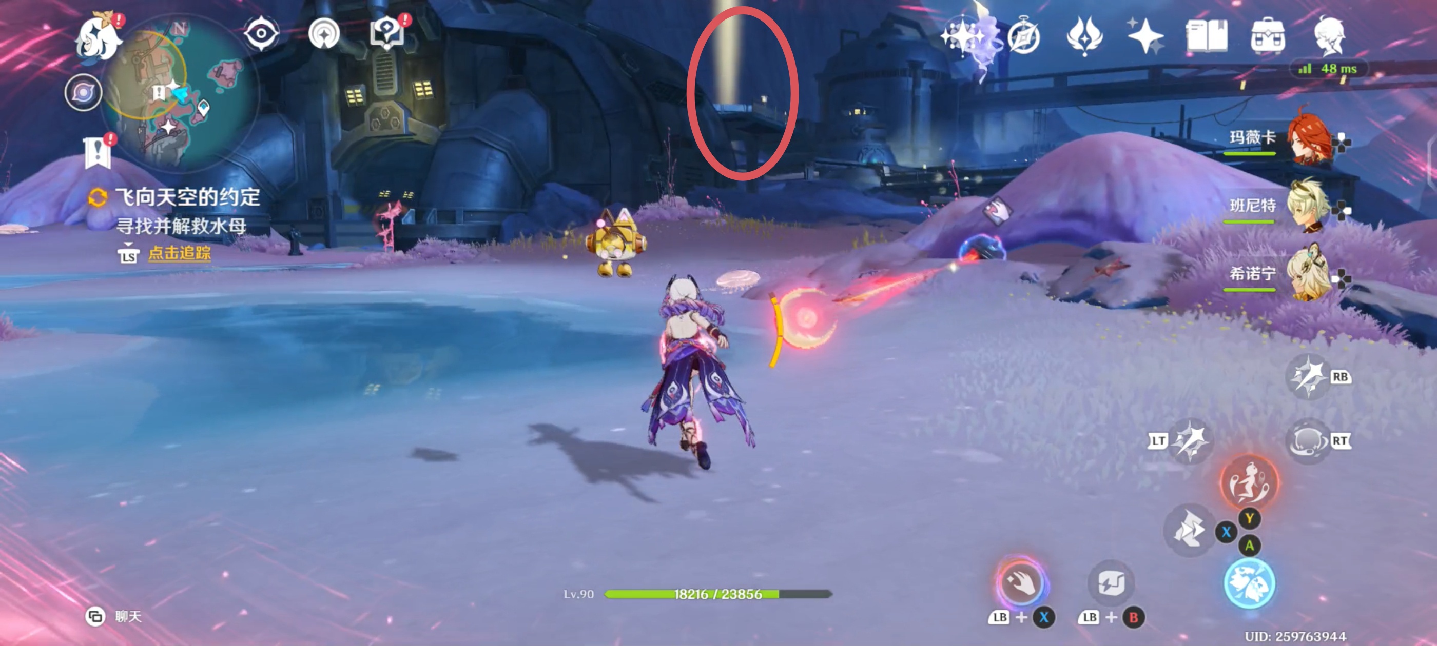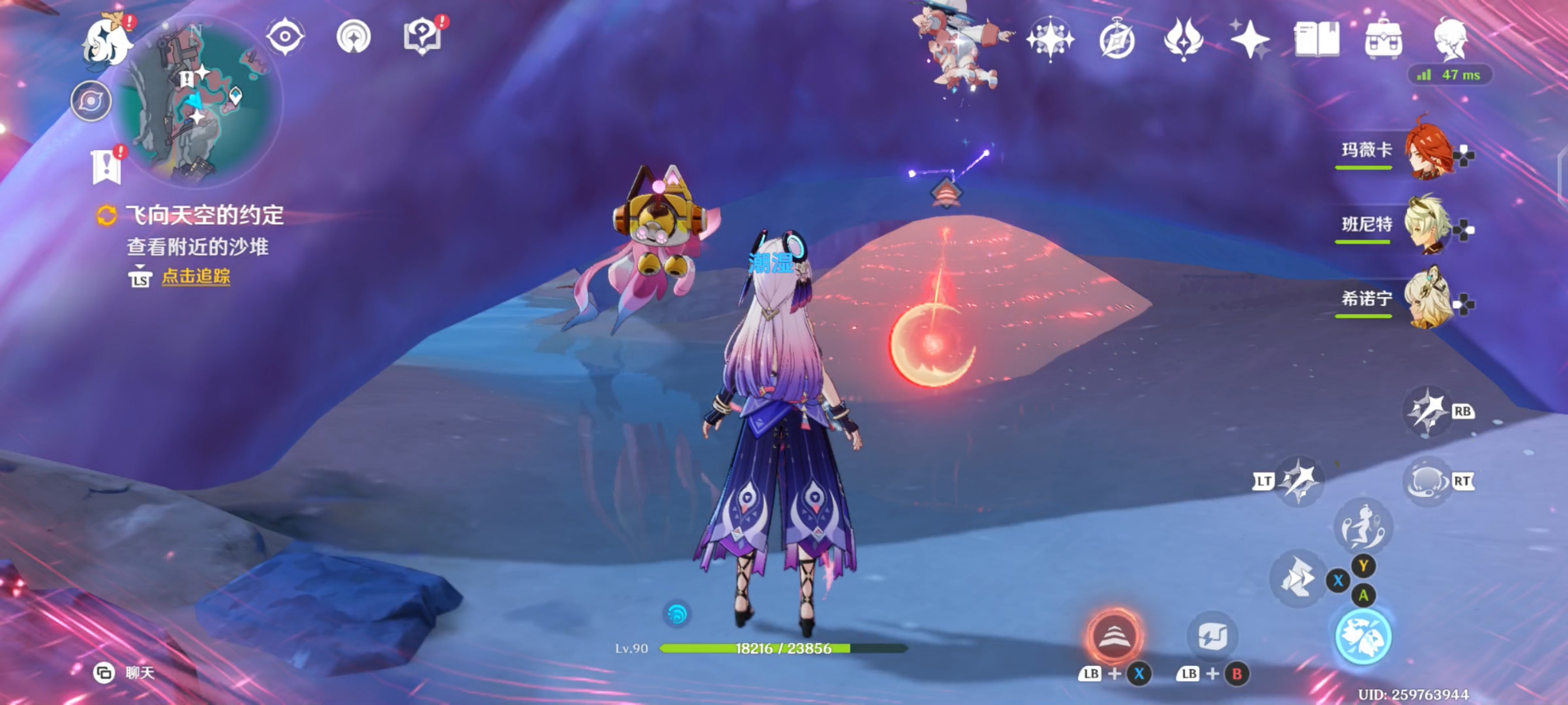 原神 飞向天空的约定任务怎么完成,来到[挪德卡莱-月矩力试验设计局]右边的[绯沙盐沼],来到位置后,向右前方的建筑旁移动,靠近水母即可自动接取任务并进入对话。