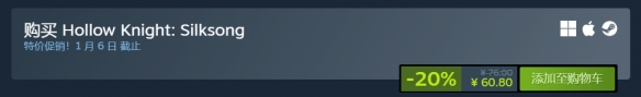 《 空洞骑士:丝之歌 》当前在Steam平台推出限时优惠,原价76元的游戏现仅需60.8元即可入手。