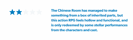 简评:The Chinese Room虽成功利用一系列“遗留组件”拼凑出一款成品,但这款动作角色扮演游戏整体体验空洞、仅止于功能层面,唯一值得称道的是角色塑造与演员表演。