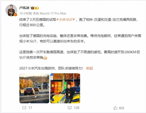 卢伟冰在社交平台分享,此次试驾让他首次体验了德国高速公路不限速的驾驶感受,最高时速达到260km/h时车辆依然保持稳定。在充电过程中,他体验了德国完善的充电设施,并经常遇到当地用户围观小米SU7,甚至有人能直接叫出车型名称。