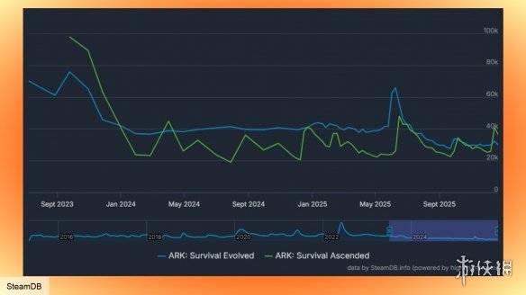 然而,自从「失落禁域」DLC 上线以来,《方舟:生存飞升》已经超越了《方舟:生存进化》,并且这种状况已经持续了好几天——上一次出现这种情况还是在 2023 年《方舟:生存飞升》刚上线的时候。这或许会成为 Studio Wildcard 一直期待的转折点。
