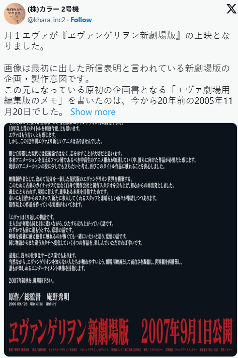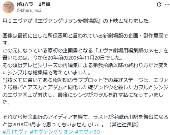 近日,随着日本重新上映系列剧场版,khara官方X账号“(株)カラー 2号机”(@khara_inc2)公开了庵野秀明导演谈及当年制作《福音战士新剧场版》的构想,甚至披露了原定剧情设定,引发粉丝热议,众人纷纷表示没想到新剧场版最初的概念竟与成品有如此大的差异。