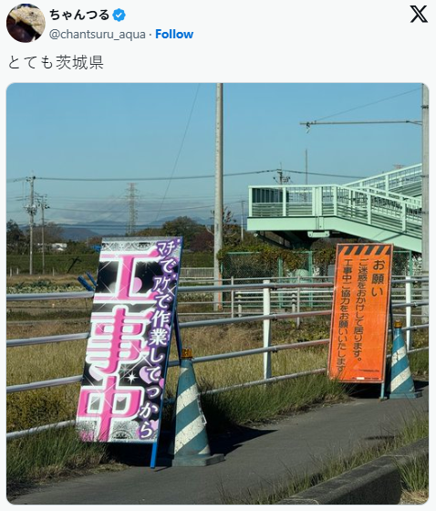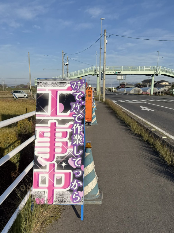 发布者称这是他日常会经过的路段,当天他正好坐在副驾驶座,等红灯时一抬头,这块粉红告示牌便瞬间闯入视野,他立刻按下了快门。牌子上那句“マヂでアゲで作業してっから『工事中』”(我们现在超嗨地施工中)让他忍俊不禁。此外,句中“してっから”的北关东腔尾音,不仅带有辣妹语感,还融合了方言的亲切感,形成了一种罕见的混搭风格。