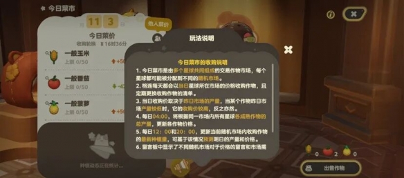 正是因为这些类似彩蛋般的反馈,让我感受到《星布谷地》是在鼓励玩家去创造生产以及探索。就像钓鱼、种菜、采摘这些容易显得重复机械的行动,游戏会给予玩家层层反馈和奖励,甚至玩家们出售作物时还会有“今日菜市”这类极其生活化的特殊玩法,其中作物价格受多个星球交易情况影响,极大提升了收获环节的乐趣。