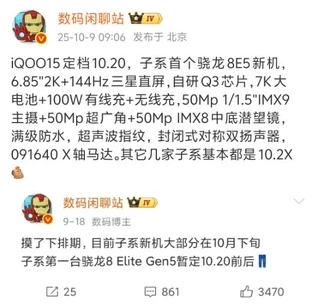 知名数码博主@数码闲聊站 透露,iQOO 15在硬件配置上实现全方位突破:核心搭载最新第五代骁龙8至尊版处理器,搭配自研Q3芯片;屏幕采用6.85英寸2K分辨率面板,支持144Hz高刷新率;续航方面内置7000mAh超大容量电池,支持100W有线快充与无线充电。