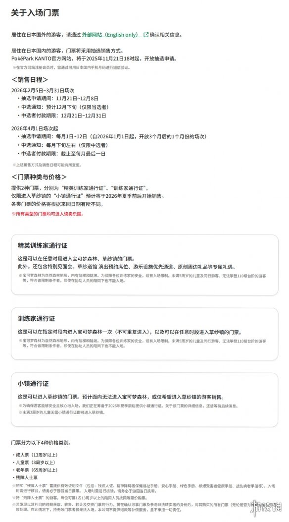如果你对PokéPark KANTO感兴趣,需要注意一下购票信息。居住在日本以外地区的游客需要通过线上网站进行购票,居住在日本的游客则需要在官网进行抽选。