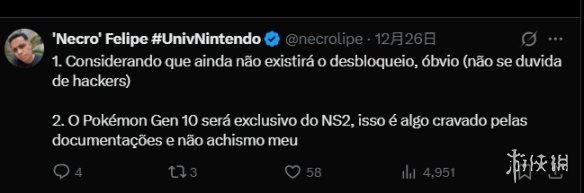 近日,知名任天堂资讯爆料人@NecroFelipe分享了《宝可梦》系列第十世代新作的相关爆料,据其透露,新作确认为任天堂Switch 2平台的独占作品。