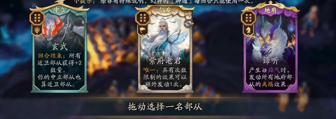 而要想玩转帝国紫府电表阵容,关键在于早一些完成天书升级,拿到虎侯和紫府老君,随后每回合尽可能地去提升虎侯的能力,并令紫府老君的能力与他进行联动,使虎侯的效果能多次触发,这样一来帝国部从的数量会增加得非常快,战力自然就能升得很高。尤其在最后决战时,若玩家手上还捏着一把皇恩或是可为虎侯提供皇恩效果的牌,还能一次性全部用出,令虎侯增加部从数量的效果和紫府老君次数限制效果额外发动一次的能力频繁触发,使阵容的战力产生质变,打对手一个猝不及防。