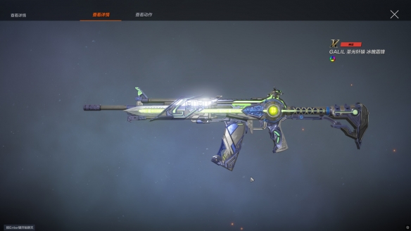 GALIL 圣光轩辕 冰魄霜锋的枪身整体蓝黑配色,多了一丝沉稳气息,对比之下枪身的绿色光效更显闪耀。